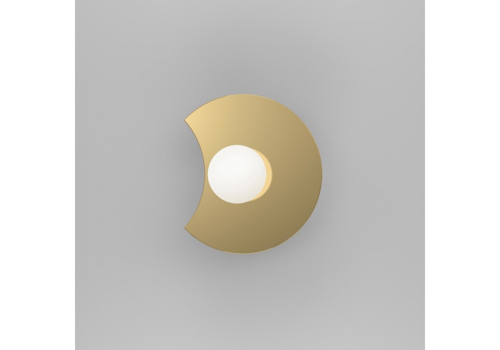 Disc and Sphere Intersecting/Bent designed by Atelier Areti is a wall lamp in polished brass, attack in white or black painted metal and white glass diffuser. Available in different models.