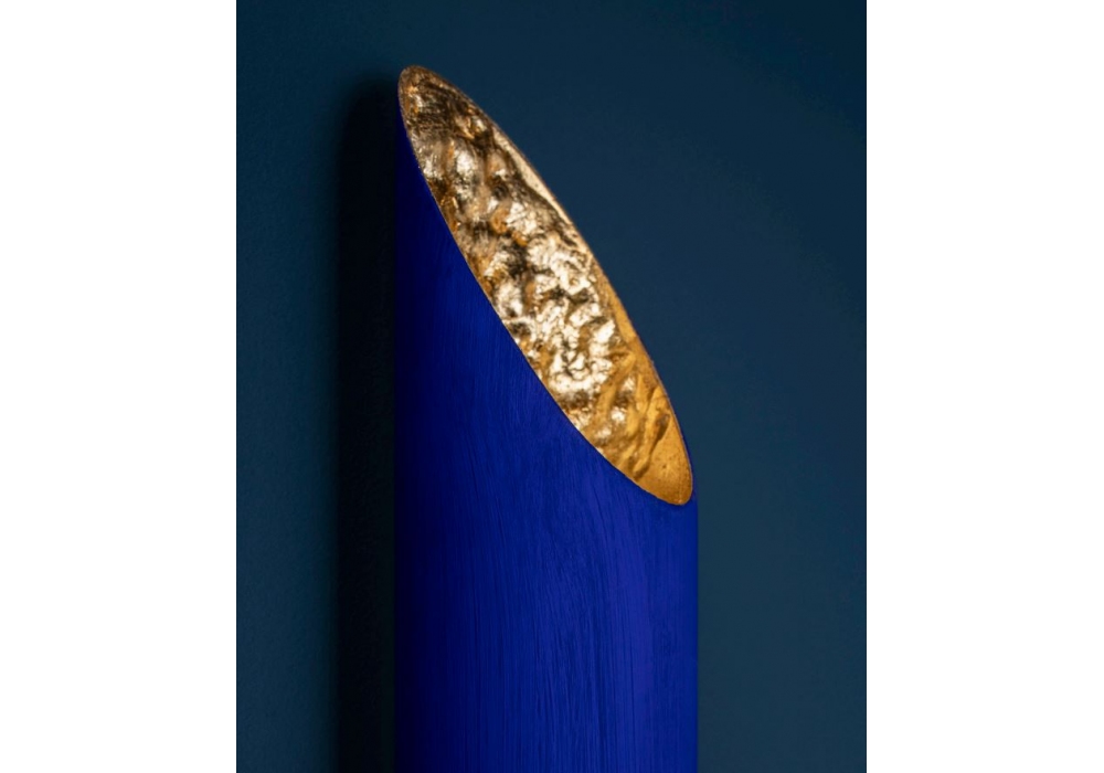 Cono W designed and produced by Catellani & Smith is a wall lamp with external power supply. The structure is a blue hand-painted metal cone, irregular interior covered in gold-colored leaf. The cable is black.
