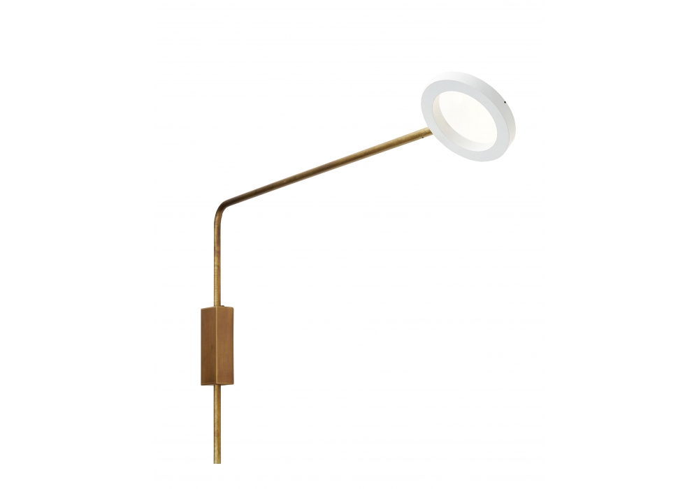 Meta designed by Franco Zavarise for Zava is a wall lamp with arm ( adjustable ) made of iron, aluminum or brass. The light source consists of a ring that contains a LED light. In the brass variant, base and disc are