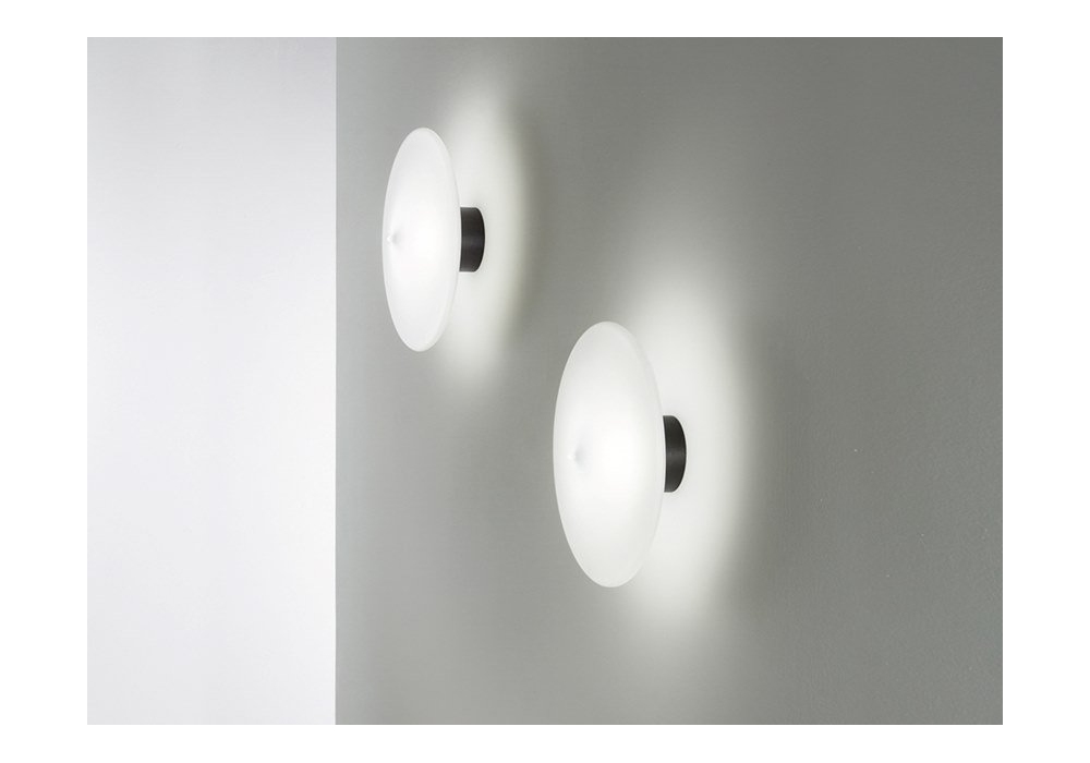 Desideria designed by Domenico Rinaldi for Fisionarte is a wall or ceiling lamp with metal structure in different finishes. The lampshade is in borosilicate glass in an opaque or transparent finish and shields a dimmable LED light source.