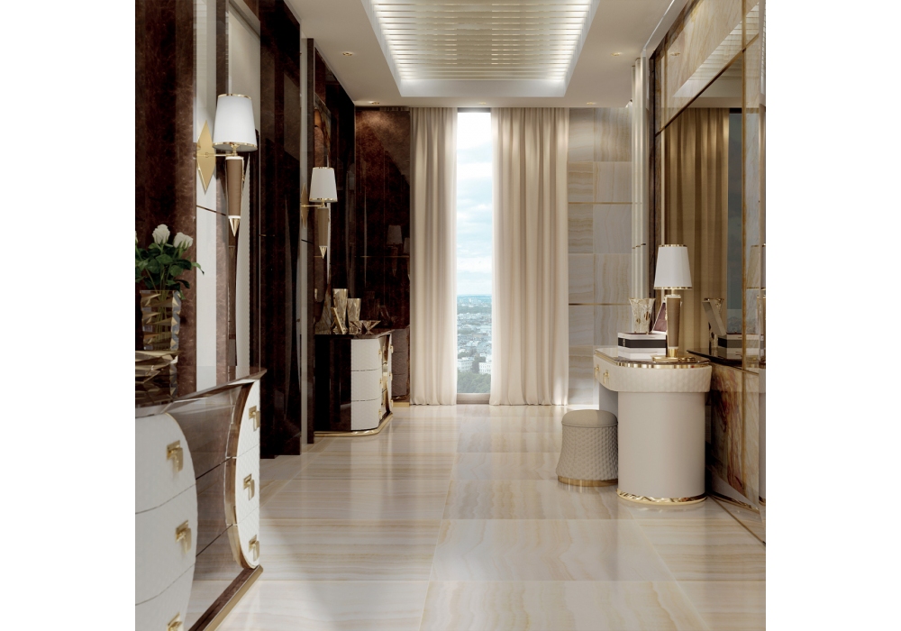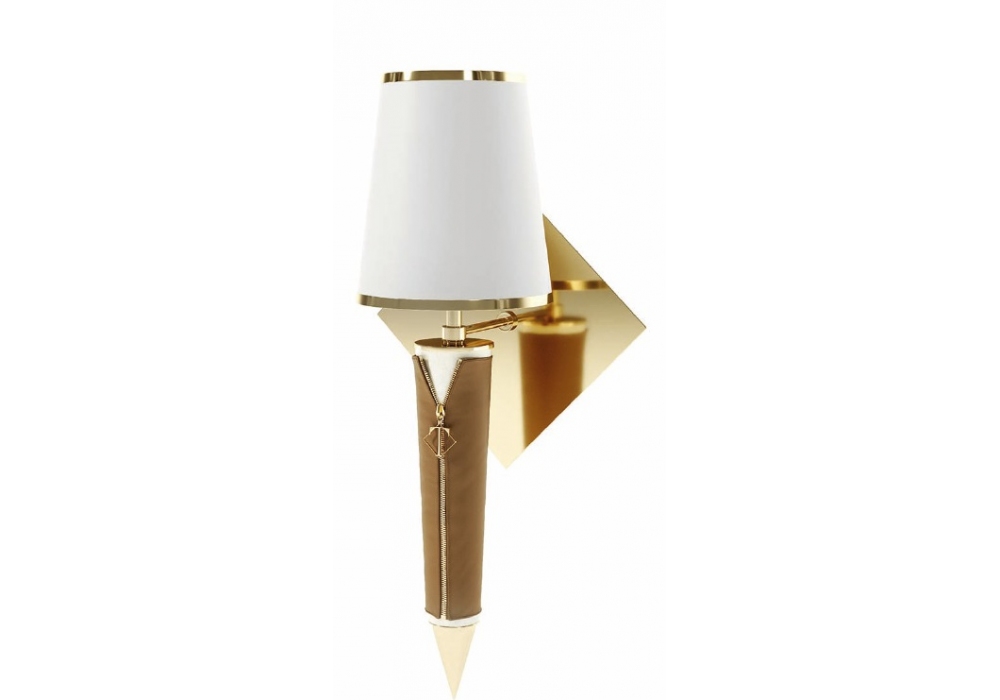 Vougue designed by Andrea Bonini for Turri is a wall lamp with a gilded metal plate that supports a cone covered in leather and fitted with a zip with logoed pendant. The fabric lampshade is embellished with gold metal details.