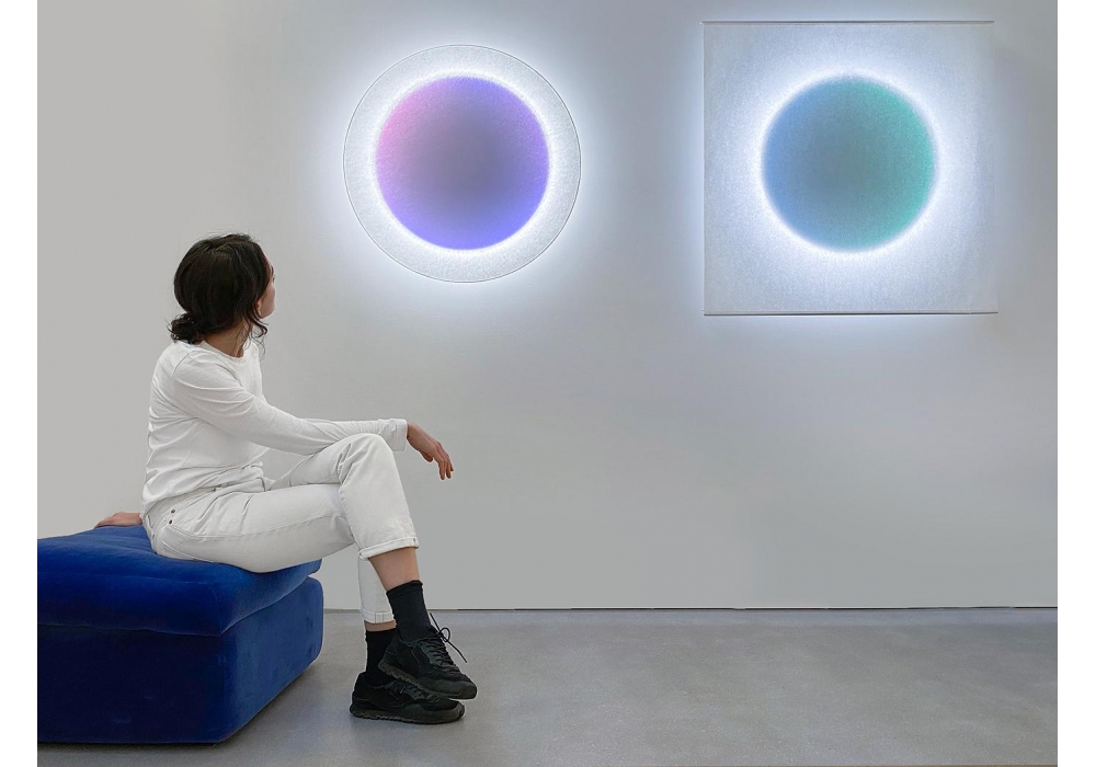 Moodmoon designed by Sebastian Hepting for Ingo Maurer is a LED wall lamp, available in different dimensions, round or square. 14 different light moods and color gradients can be selected via an app.
