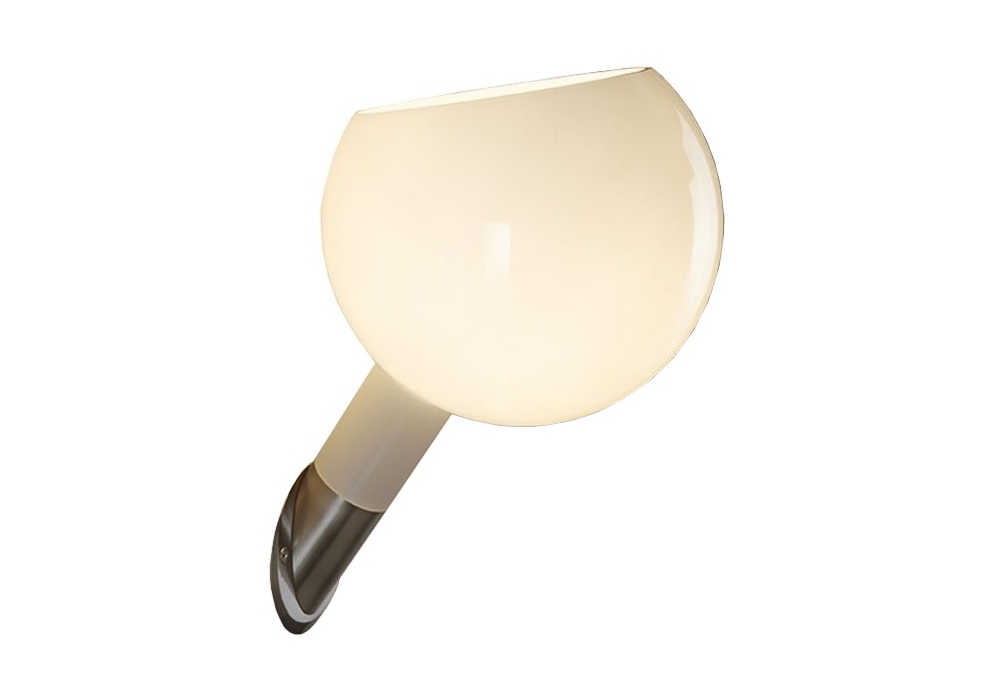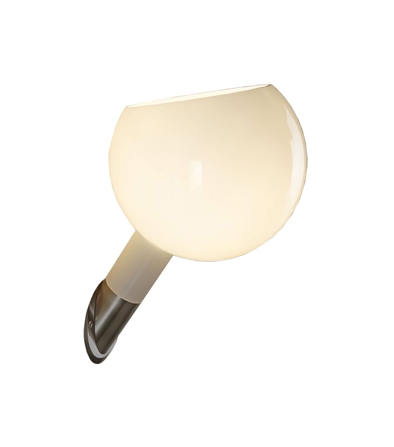 Parola designed by Gae Aulenti and Piero Castiglioni for Fontana Arte is a dimmable wall lamp providing diffused light with diffuser in glossy colored paste blown glass. Wall support in nickel-plated brass metal. Available in different finishes.