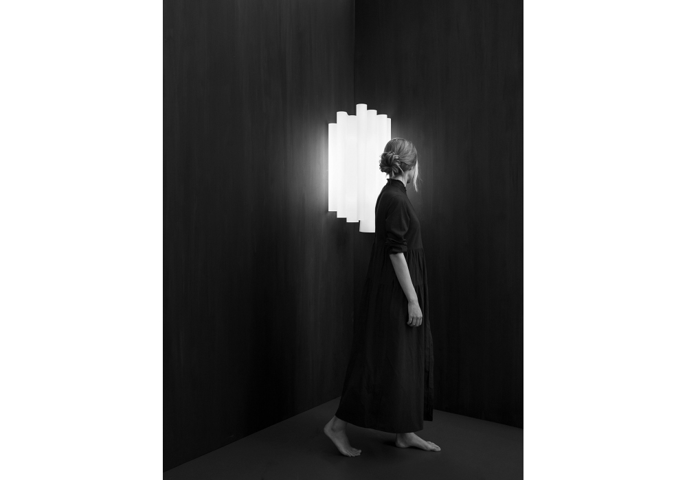 Vertical Nest designed by Brian Thoreen for Tacchini is a corner wall lamp in white polycarbonate, with deco and contemporary lines.