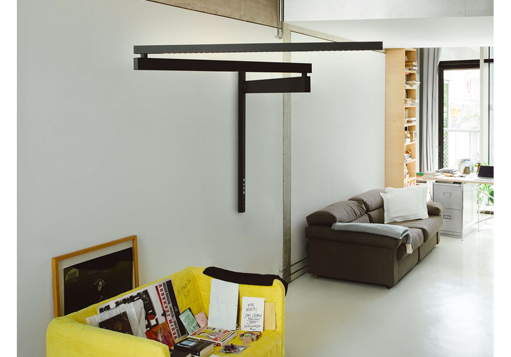 Black Flag designed by Konstantin Grcic for Flos is a wall lamp structured by various movable quadrangular aluminum arms painted in black. The head has a quadrangular aluminum body with a polycarbonate diffuser and shields a dimmable LED light source. Black Flag is available in different versions.