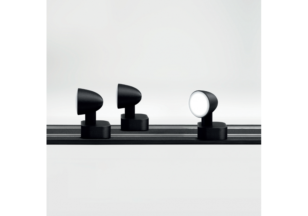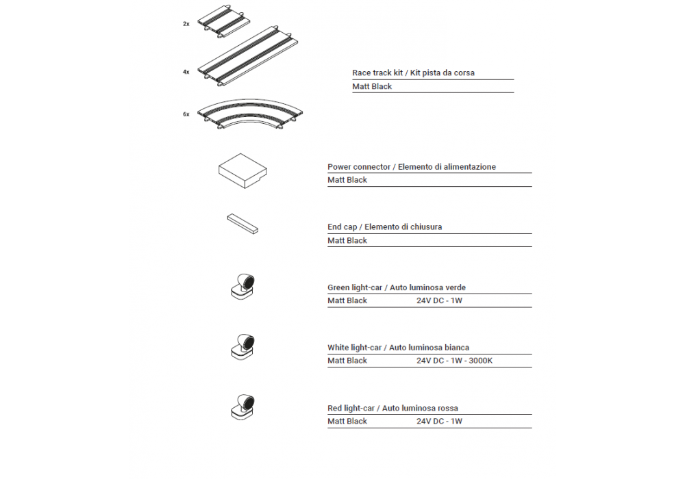 Race Of Lights produced and signed by Davide Groppi is a wall lamp in the shape of an electrified toy track, which brings electricity and powers small car-bulbs. The path can be composed as desired and becomes the basis for building your own light design. The car-bulbs are fixed magnetically, to create free and changeable compositions. A simple and intuitive system, where the light can be moved and reinvented at any time. Race of lights is made up of 12 ways to compose the race track, a power element, a closing element and three luminous cars (green, white and red). Remote or plug-in power supply included.