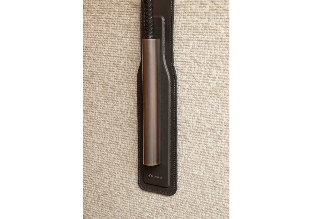 G+T Nomad designed by Jan Van Lierde for Contardi is a lamp with a metal base and diffuser and a dark brown woven leather frame. The head features a 3-level dimmer switch (100%, 70%, and 30%). Available with various accessories for wall, table, or sofa mounting. It offers up to 10 hours of battery life. It charges in 6–8 hours via USB-C cable (included). Power adapter not included.