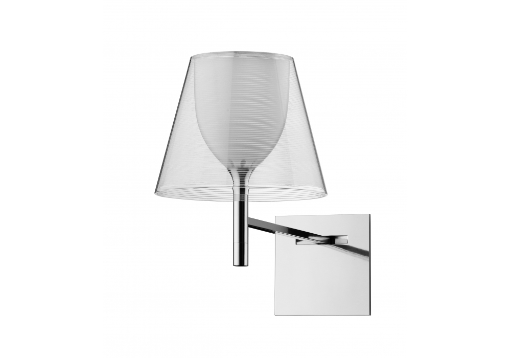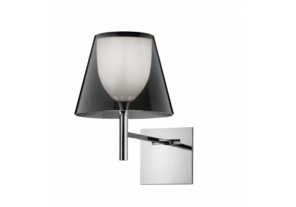 KTribe W designed by Philippe Starck for Flos is a wall lamp with diffused light and intensity adjustable on four levels via remote dimmer. Structure in chromed zama, polished aluminum and galvanized steel. Internal diffuser in opal polycarbonate and external screen in PMMA. Integrated dimmer. Bulb not included.
