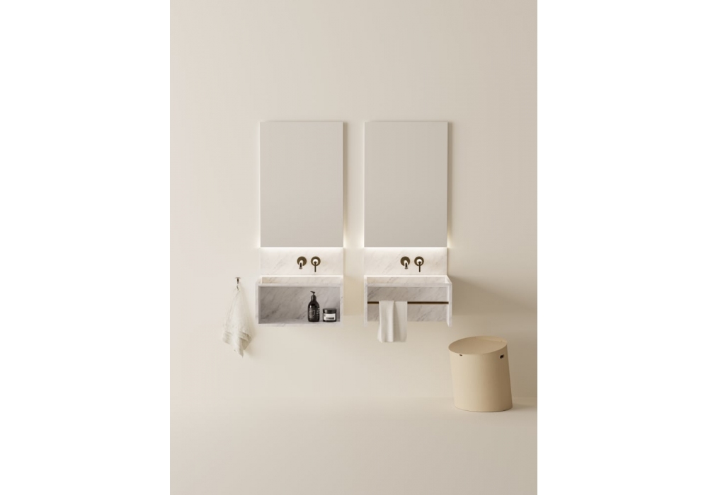 Face à face designed by Jean Nouvel for Agape is a wall-mounted washbasin made of marble slabs. Available in the version with shelf or towel holder white for the Carrara white finish and black for all the others.