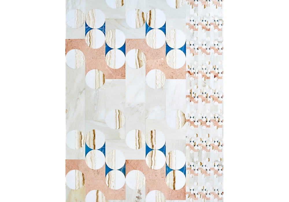 Ballon designed by Patricia Urquiola for Budri is a wallpaper composed of wall inlay, curved element, and floor. Roll of marble in Bianco Lasa completes the realization. Micro pattern only on request.
