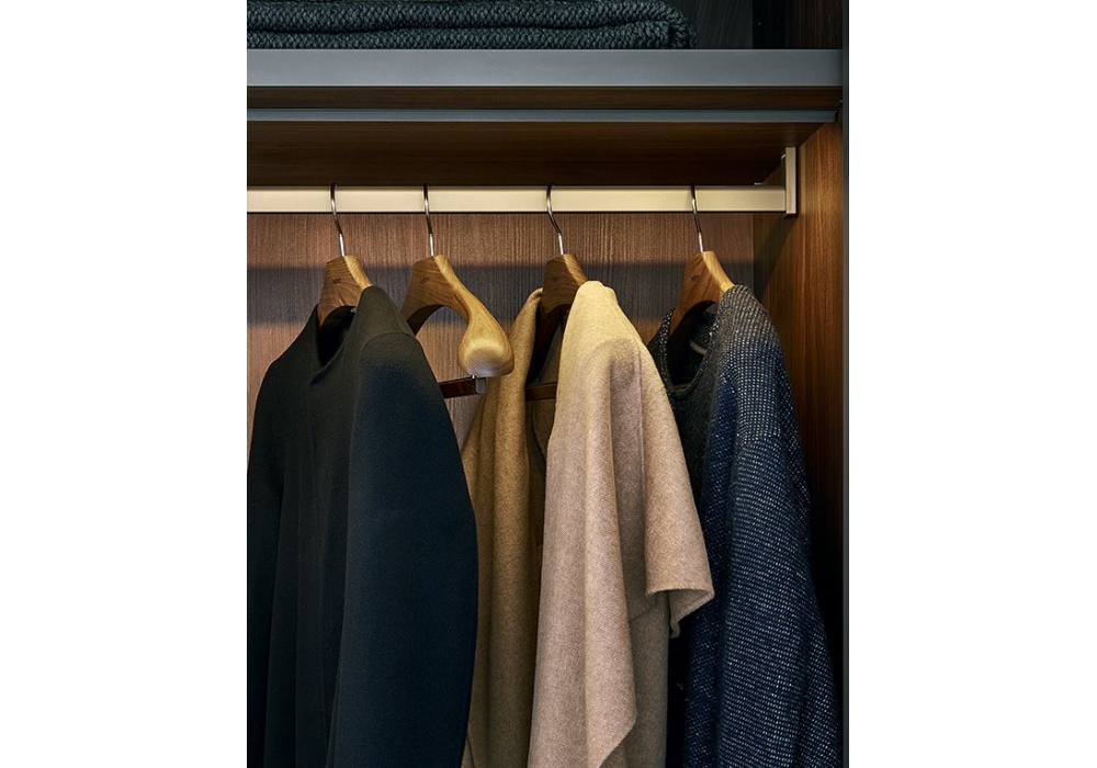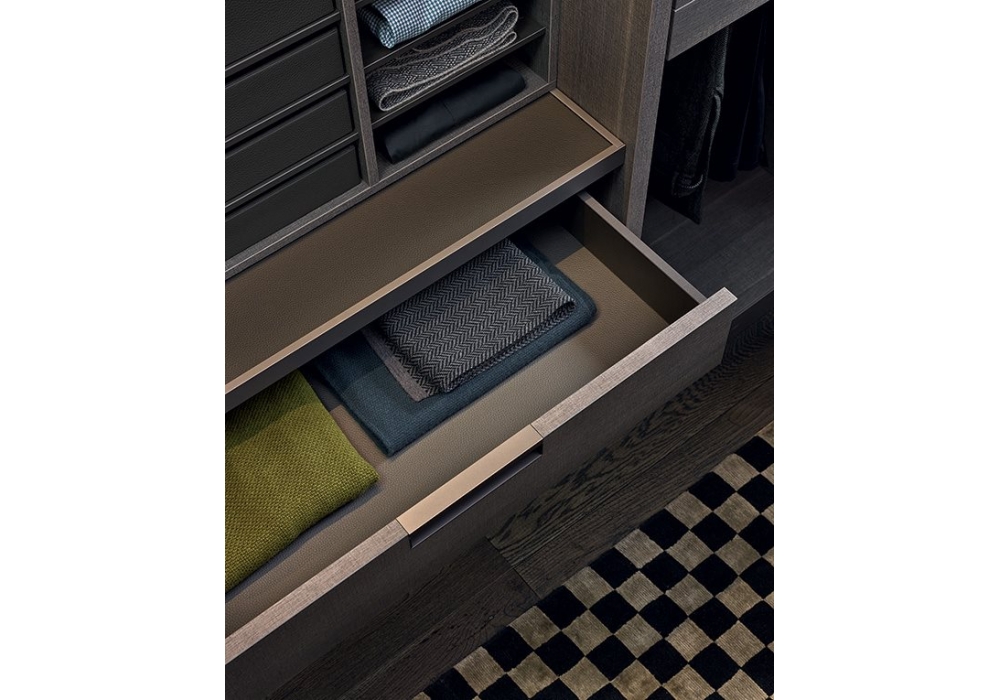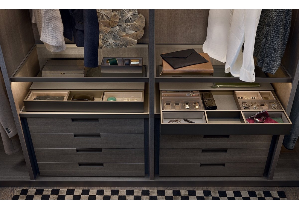 Senzafine designed by R&D Poliform is a walk-in closet with an exceptional aesthetic and functional personalization.