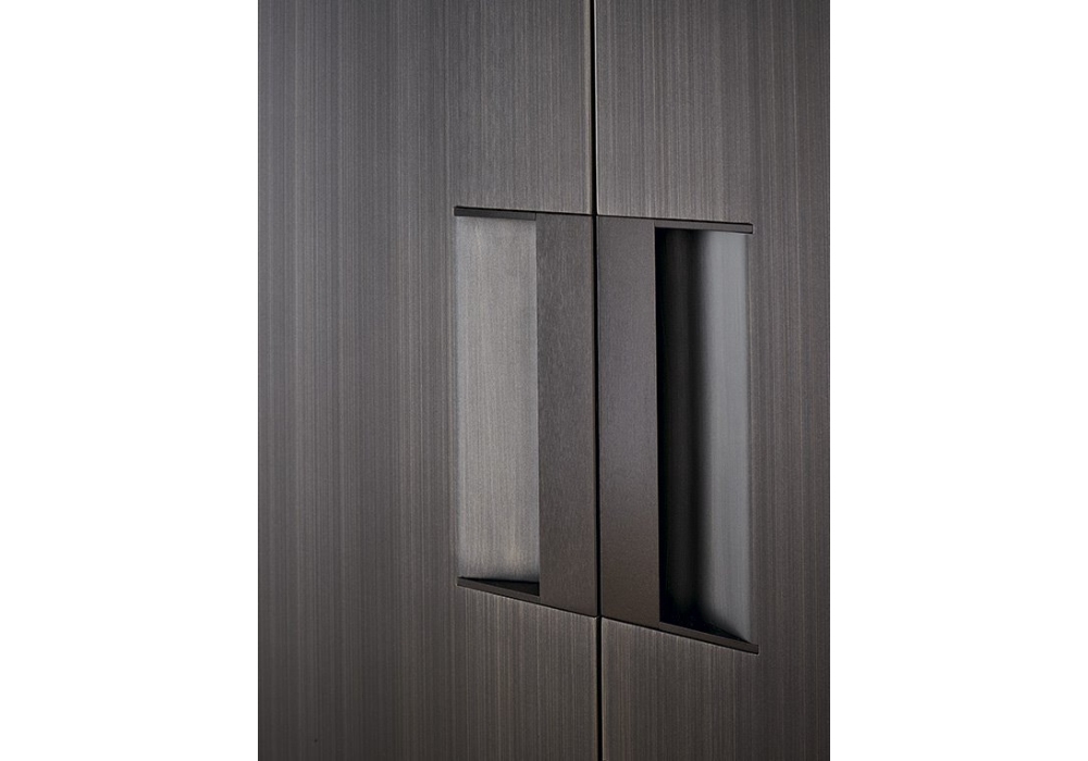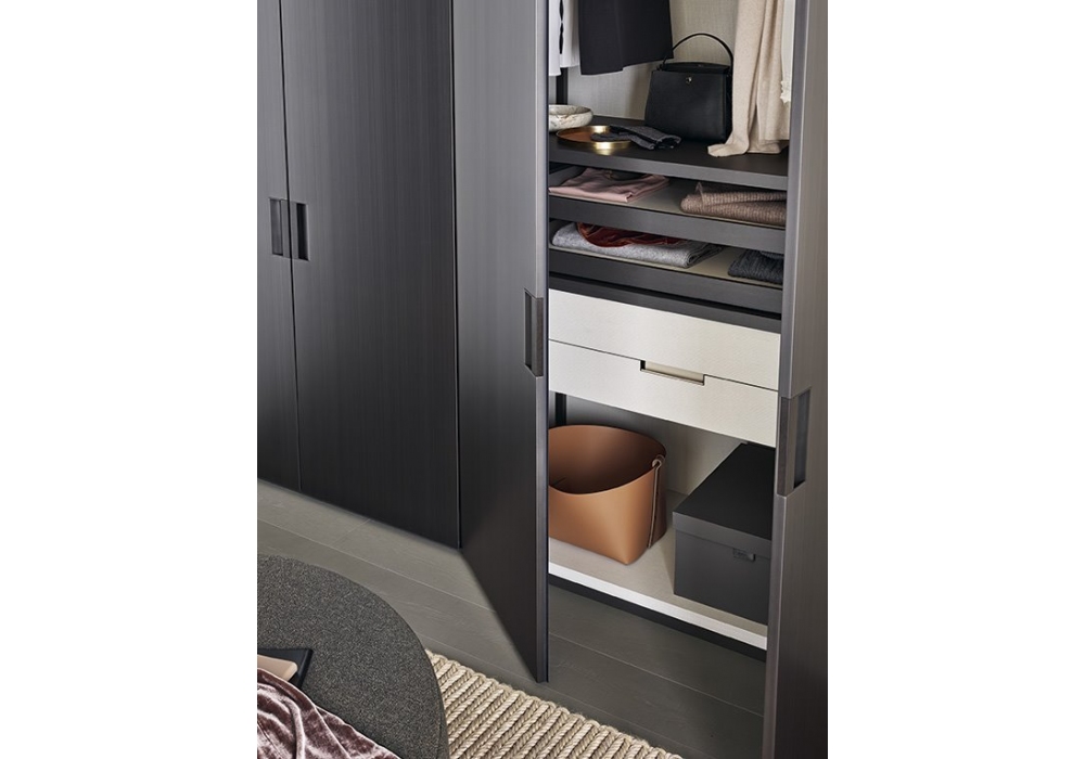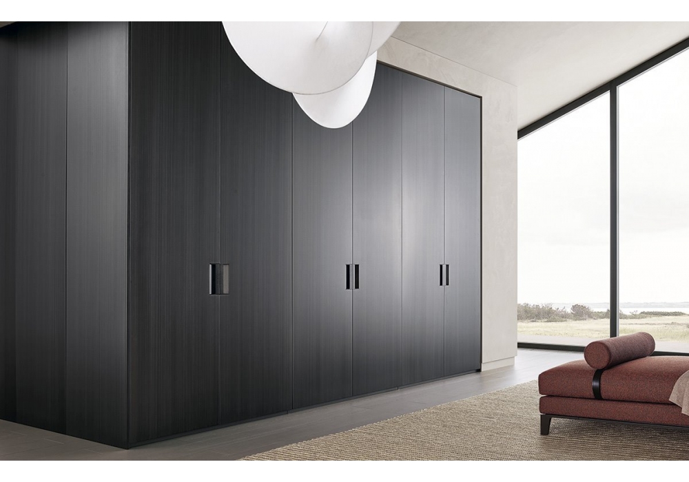 Plus designed by R&D Poliform is a wardrobe with doors in oak, walnut, black elm or lacquered. Opening door available in hinged and sliding version with integrated handle.