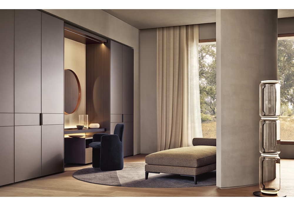 Cover designed by R&D Poliform is a wardrobe with doors in techno-leather, fabric and glass. Opening door available in hinged and sliding version. Profile in painted aluminium.
