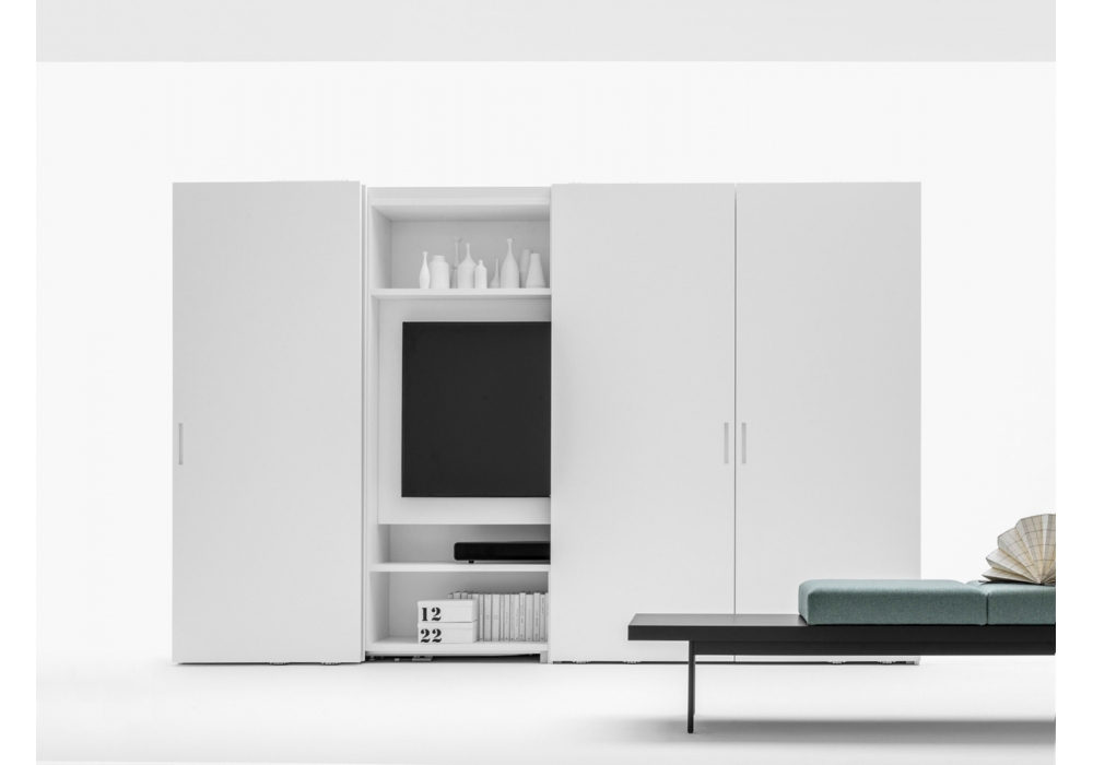 Core Coplanare designed by R&D Caccaro for Caccaro is a modular system with a coplanar opening mechanism that allows the door to come out of its seat and slide fluidly on the other. Outside, no difference in height when the module is closed. Available in different finishes and dimensions.