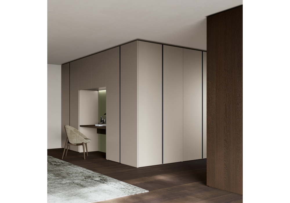 Nodo designed by Dall'Agnese is a wardrobe with pouring doors made with wooden particles panels with melamine enlosure, lacquered or veneered wood and painted. Opening by means of vertical throat in painted metal.