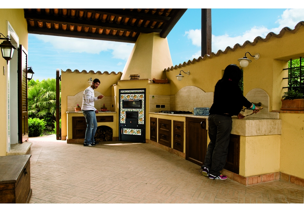 The cooking chamber is in stainless steel AISI 304 on 2 levels, equipped with ventilation and illumination. Handles in brushed stainless steel with wooden details and snap closure. Sliding ash drawer with adjustable air intake. Food heater with leaf door. Caltagirone is a coating of the Sicily Collection.