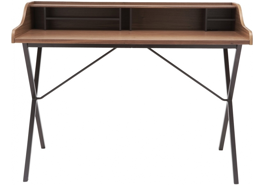 Ursuline is a writing desk designed by Pierre Paulin for Ligne Roset. Within the Ligne Roset collection, this graceful apartment desk with its feminine allure complements the Tanis desk (1954 / 2008), the appearance of which is more masculine and severe. Desk with work surface, chests and edging in panels of particleboard and MDF. Cross-shaped base in Epoxy lacquered tubular steel. Finish: entirely in satin-finish white lacquer or top and edging finished in natural walnut veneer; feet and chests in satin-finish brown lacquer.