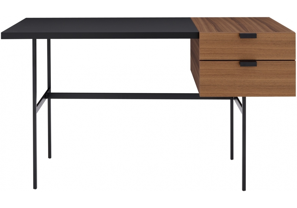 The writing surface is made from soft-touch, scratch-resistant FENIX laminate, in black to match the black lacquered steel base, whilst the 2 drawers are finished in natural walnut veneer.