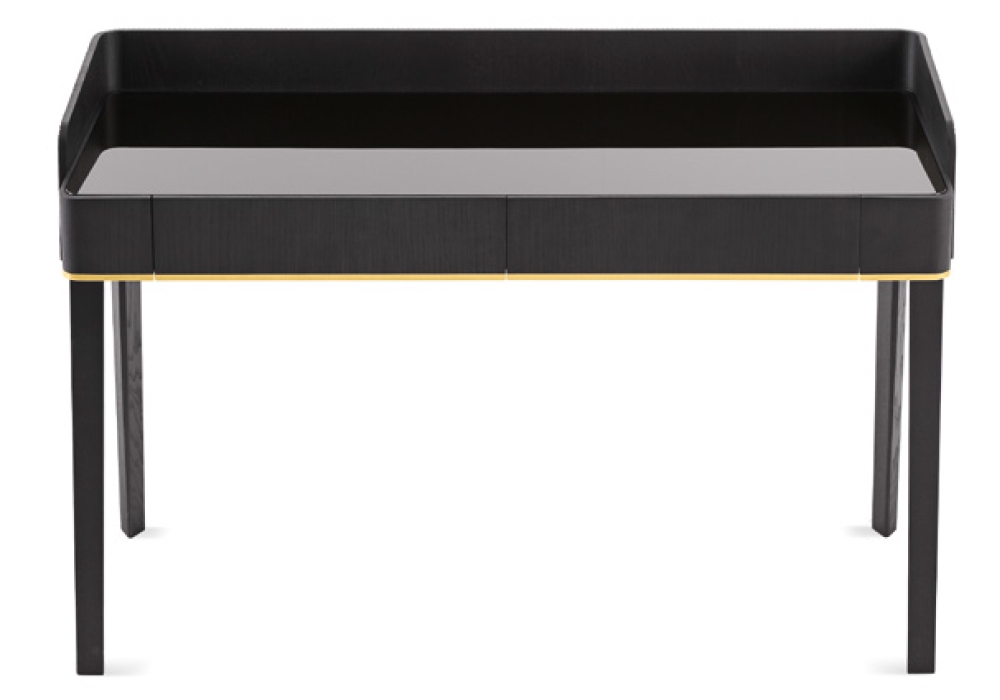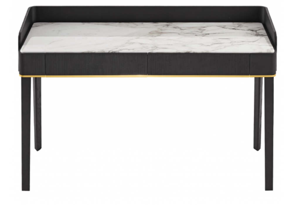 Soho designed by Carlo Colombo for Gallotti&Radice is a desk in black open pore lacquered solid ash with hand-knurled sides. Calacatta Vagli Oro marble or 12mm liquorice painted glass top, in the bright or satin version. Supplied with two drawers with suede Grey 020 bottom. Bright brass metal parts. On request, small boxes covered by suede Grey 020.