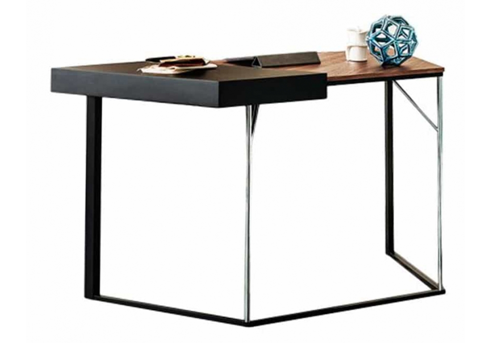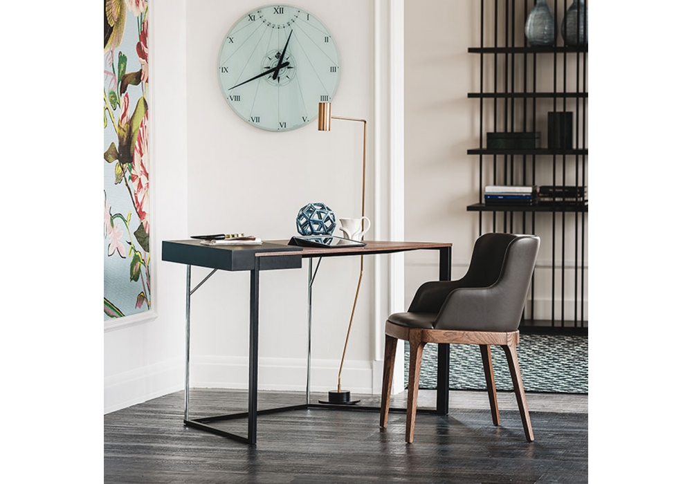 Clarion designed by Andrea Lucatello for Cattelan Italia is a writing desk with structure in black or graphite embossed lacquered steel and partly in chromed steel. A part of the top is made of lacquered MDF in the same finish as the structure and a part in Canaletto walnut or burned oak.