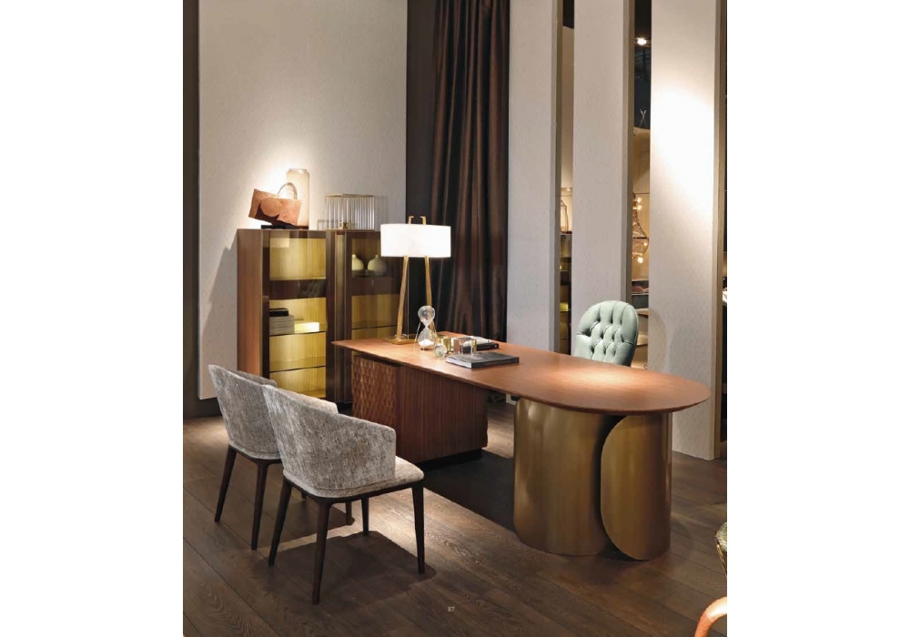 Erik designed by Castello Lagravinese Studio for Opera Contemporary is a writing desk made of wood, supported by a built-in chest of drawers and a hollow cylindrical metal base.