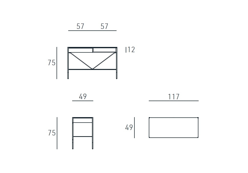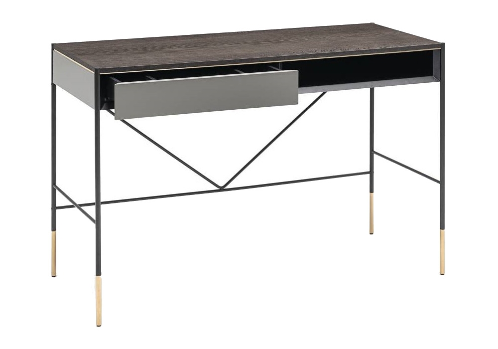 Era designed by David Lopez Quincoces for Living Divani is a writing desk consisting of a central body in MDF, with external panels in MDF veneered in Stone Oak® or walnut stained canaletto or glossy varnished, front part divided into open compartment and drawer removable with Blum® guides, divided into 3 compartments at different heights and capacities. Support surface in 18 mm thick MDF, with brass painted steel sheet frame, coupled to the central body by bushes and pins.