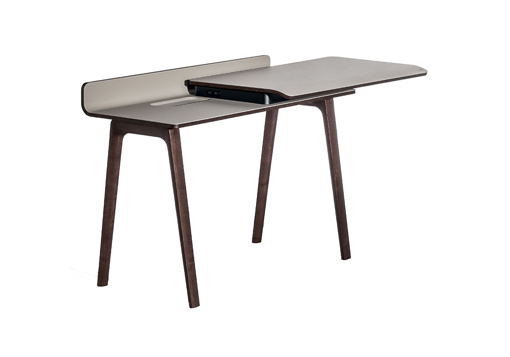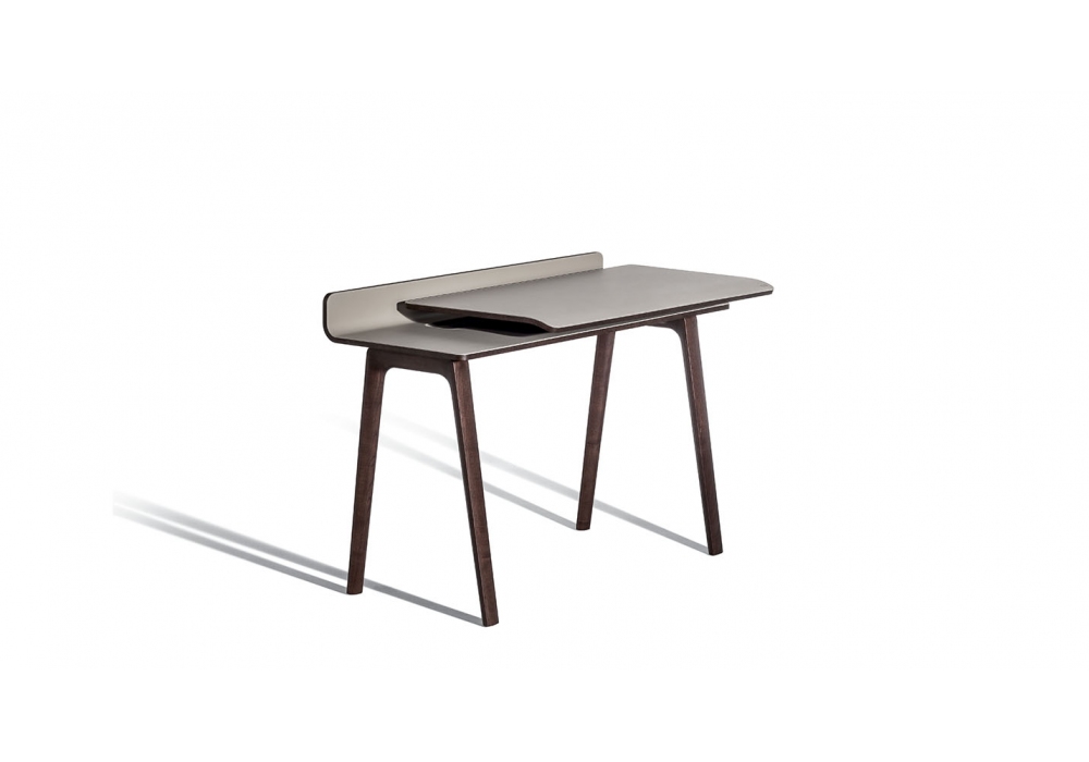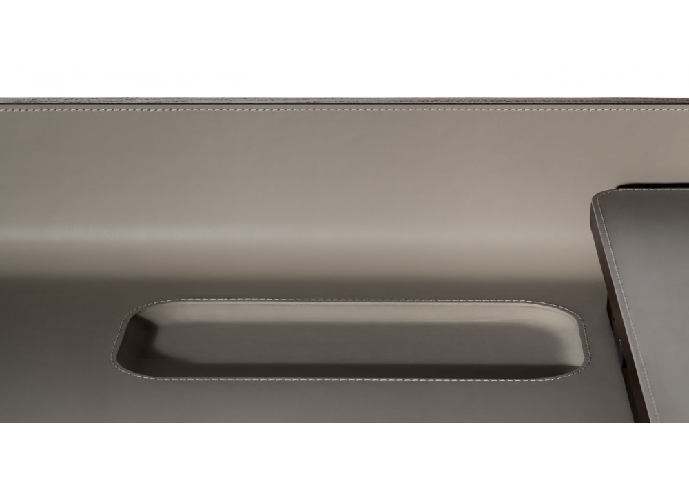 Iren designed by Kensaku Oshiro for Poltrona Frau is a writing desk composed of two overlapping tops in beech plywood with ash edge covered in Pelle Frau leather. The desk is available in two versions: freestanding and wall. In the freestanding version, the anchoring plate between the top and the base of the stand is in steel and matt black lacquered. While for the wall version the top is supported and fixed to the wall with a solid ash structure, undertop plate and two brackets in matt black lacquered metal. The wall bracket can be equipped with LEDs. The edges of the tops are veneered in ash. While the base of the easel and the wall support are made of solid ash.