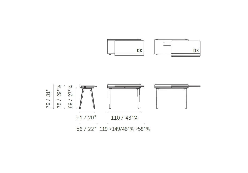 | Dimensions | • 119/149 x 51 x H 79 cm; • 119/149 x 58 cm |