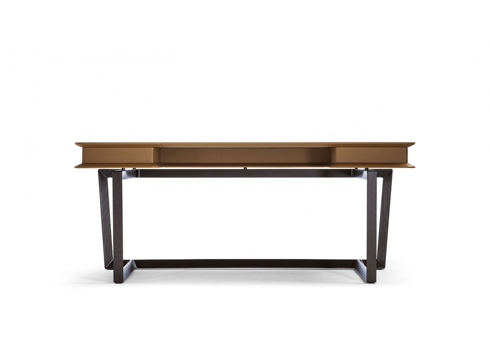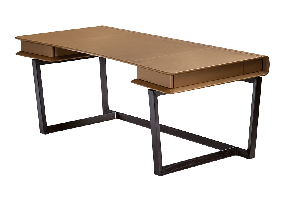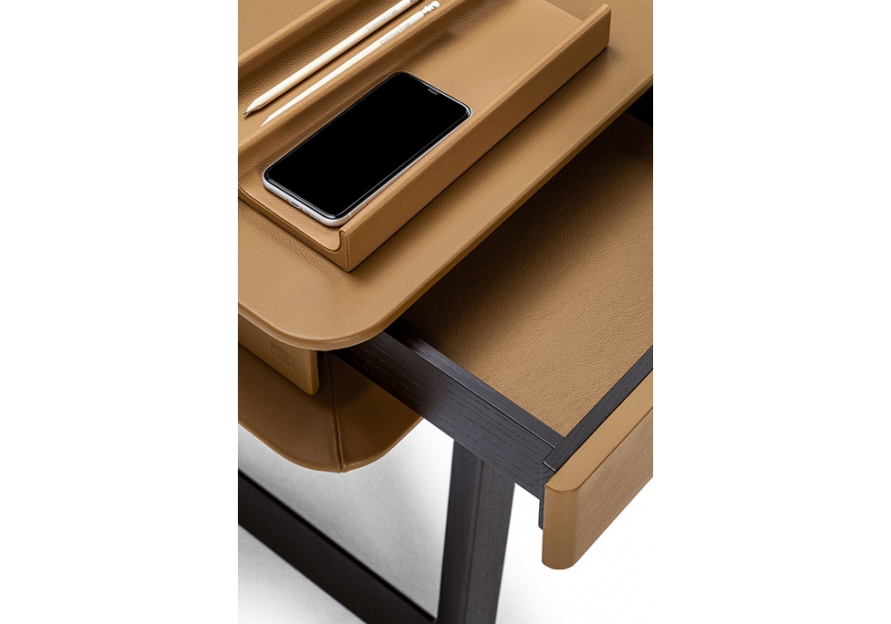 Peek-a-Book designed by Roberto Lazzeroni for Poltrona Frau is a desk with supporting structure made of stained solid ash and the top shaped and made with poplar plywoods panels counter veener with MDF. The top, front and sides of the drawers and doors for accessing the rear compartments are upholstered in Pelle Frau®. The desk has two front drawers and two compartments behind the drawers that can be accessed from doors at the side. The compartments are designed to act as a conduit for cables and can be used to house multi-sockets or electric. The internal structure of the drawers is also made from solid ash in a wenge stain. The front is made from MDF covered in Pelle Frau® leather matching the upholstery of the top.