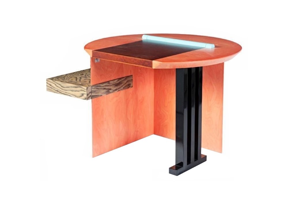 Sophia designed by Aldo Cibic for Memphis Milano is a writing desk made of pre-composite wood, briar and lacquered wood.