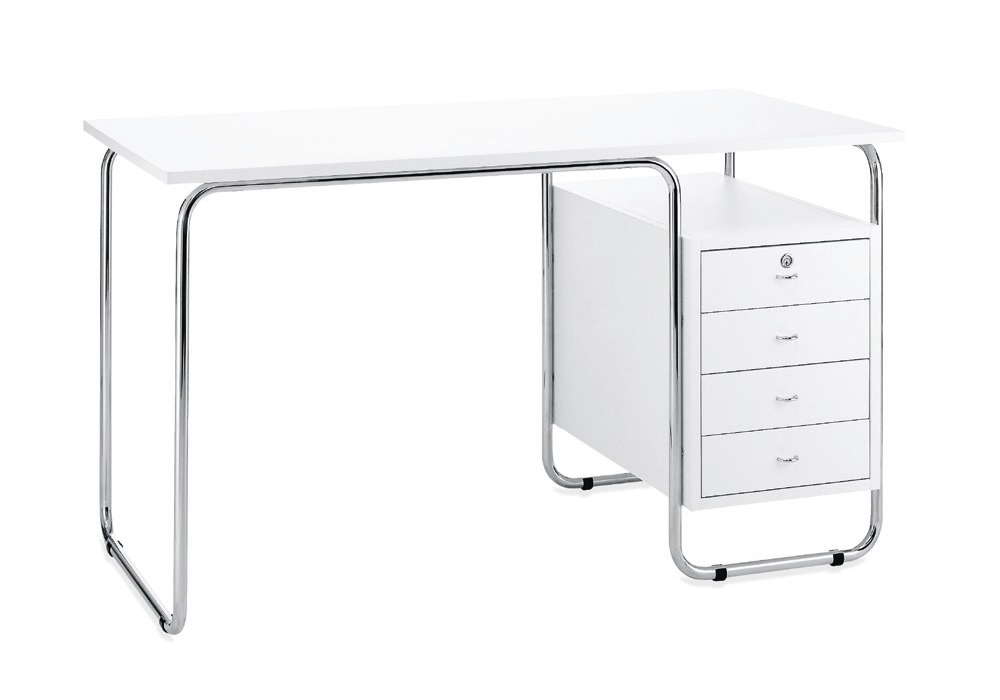 2725 Comacina designed by Piero Bottoni for Zanotta is a desk made with structure in 18/8 stainless steel tube. Top and chest of drawers painted scratch-resistant embossed in white or black. The top can be with an insert in pigmented leather 90. The chest of drawers can be positioned to the right or left of the seat.