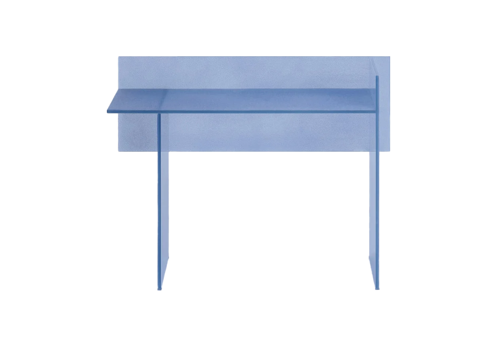 Simoon designed by Patricia Urquiola for Glas Italia is a writing desk made by gluing 12 mm extralight glass sheets to UV. ground polished edge, whose surface is coated with a special grit obtained from chopped Murano glass, available in amethyst, light blue and topaz colors.