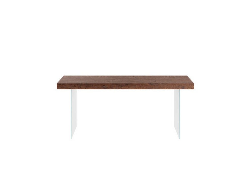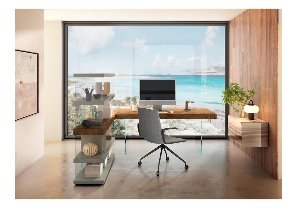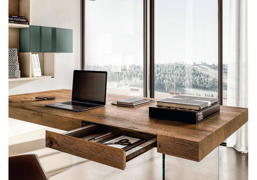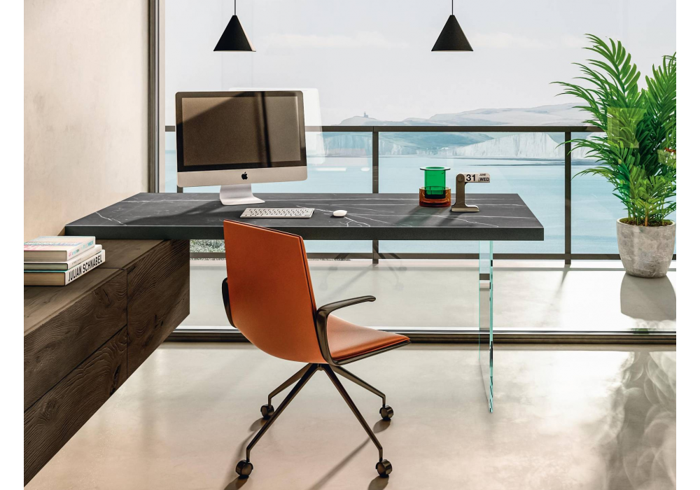 Air Desk designed by Daniele Lago for Lago is a desk with a top available in glass, Wildwood or lacquered in different colors and legs in tempered glass. Two almost invisible glass legs support the table top, which seems suspended in the air.