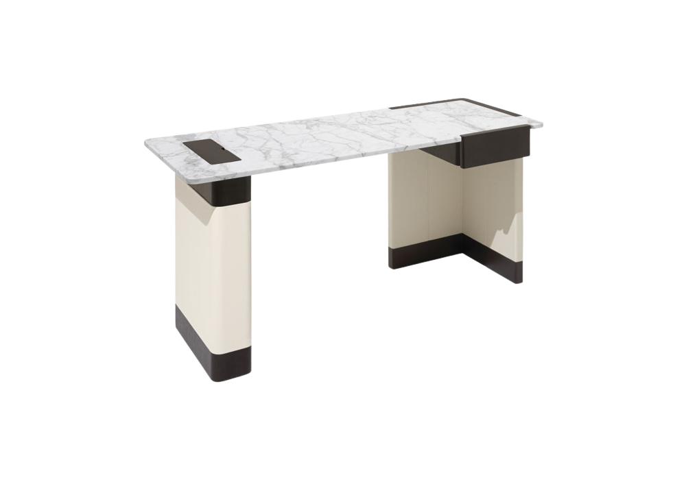 Edward designed by Dainelli Studio for Giorgetti is a writing desk with ash structure, in different finishes. The base is covered in leather, in the central part, in various colors. The top is in marble or ash, with a choice of finishes. It is possible to select different kits of internal and external accessories.