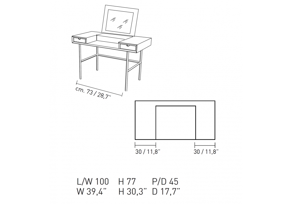 Chapeau designed by Radice Orlandini for My Home Collection is a desk with lacquered tubular steel base. The top is in matt lacquered wood fiber enriched with leather inserts while on the sides there are two drawers and a central open compartment. The dressing table is equipped with a flap mirror with an object holder area in the lower part, also covered in leather.