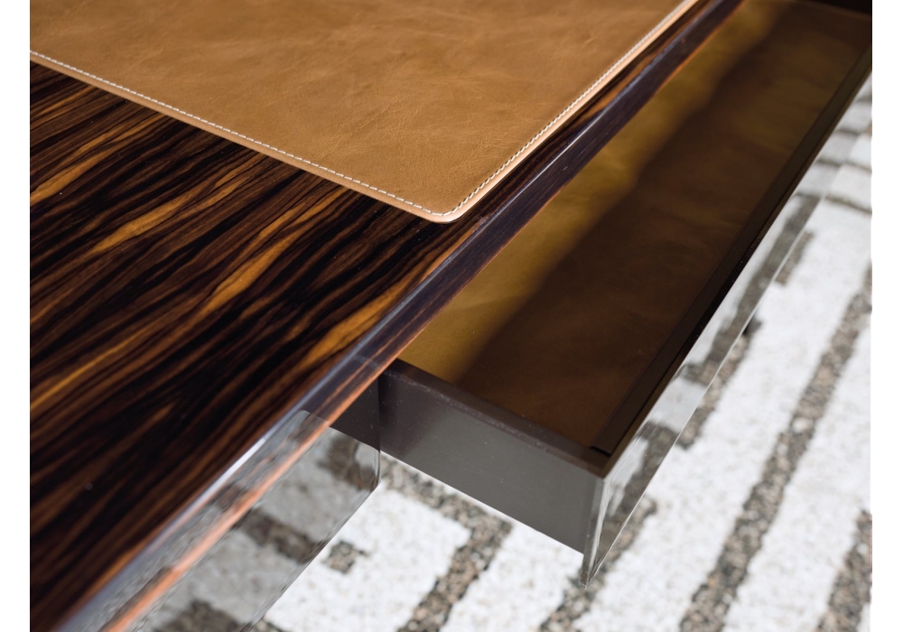 William designed by Giuseppe Viganò for Longhi is a desk with wooden or glossy lacquered structure and metal base. Desk top and inside drawers covered in leather. Choice of marble or leather handles.