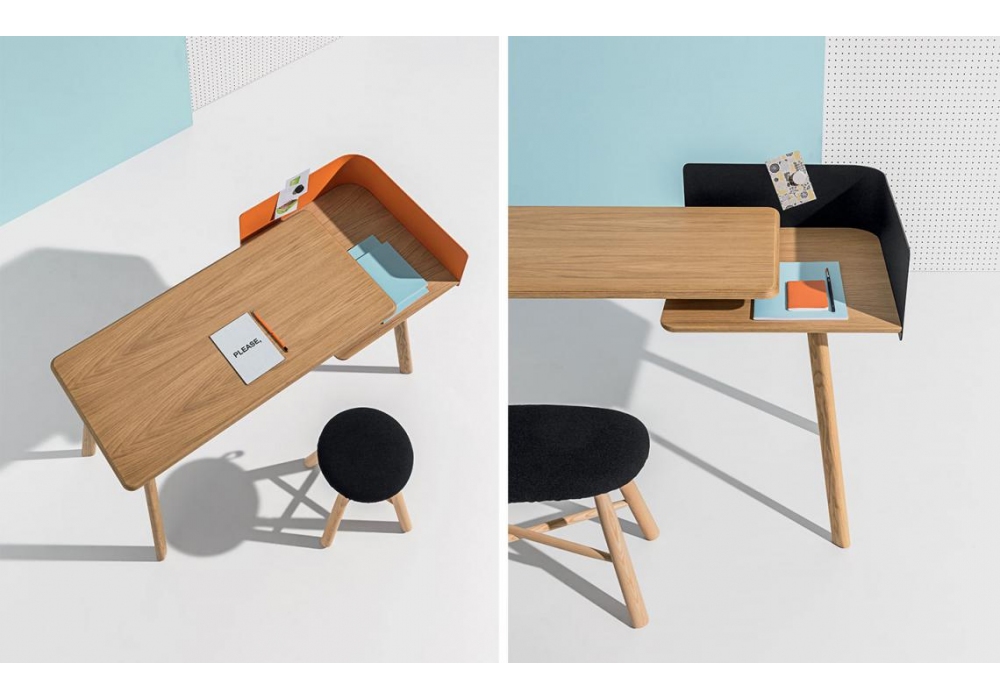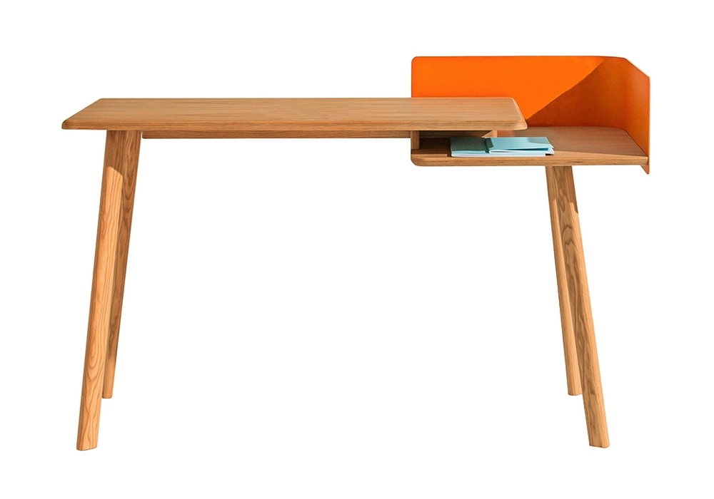 Cut designed by Studio Saudubray Soler for Discipline is a writing desk with top and shelf for objects in natural oak, legs in ash and side in embossed metal. Available in different finishes.