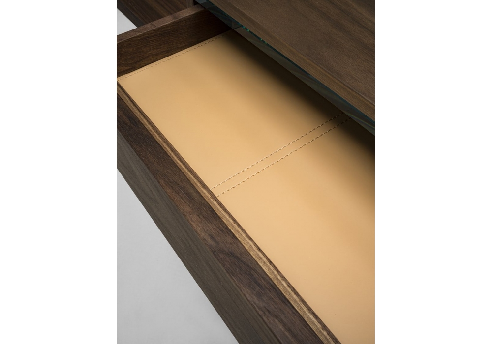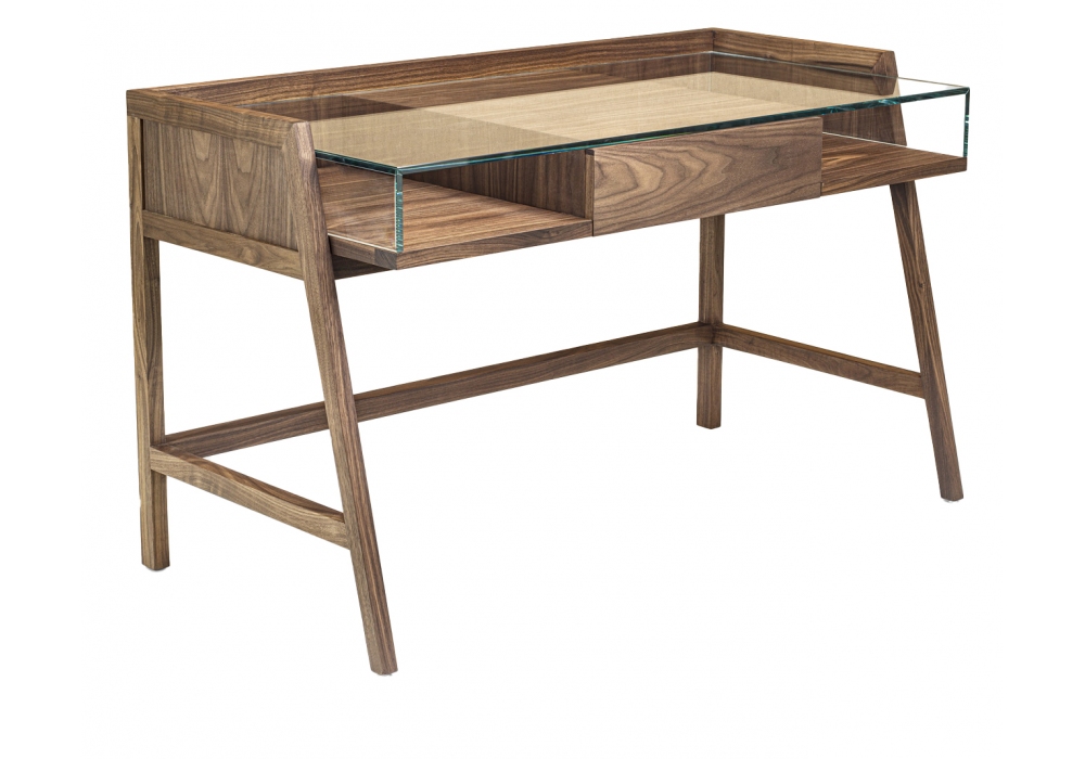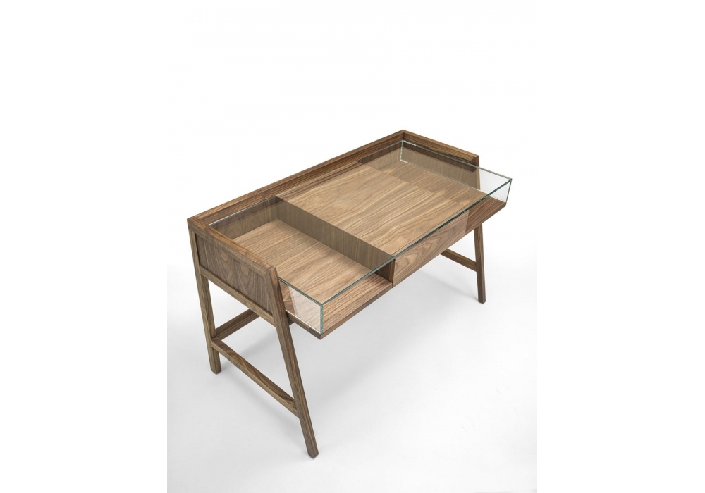 Writing designed by Giovanna Azzarello for Riva 1920 is a writing desk with structure made of blockboard and solid wood and glass worktop. Equipped with central drawer assembled with dovetail joints.