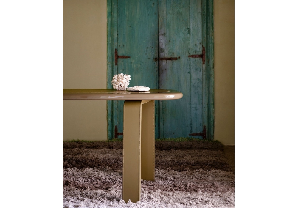 Orbit designed by Faye Toogood for Tacchini is a desk characterized by curved wooden legs covered in leather, lacquered top with rounded leather insert.