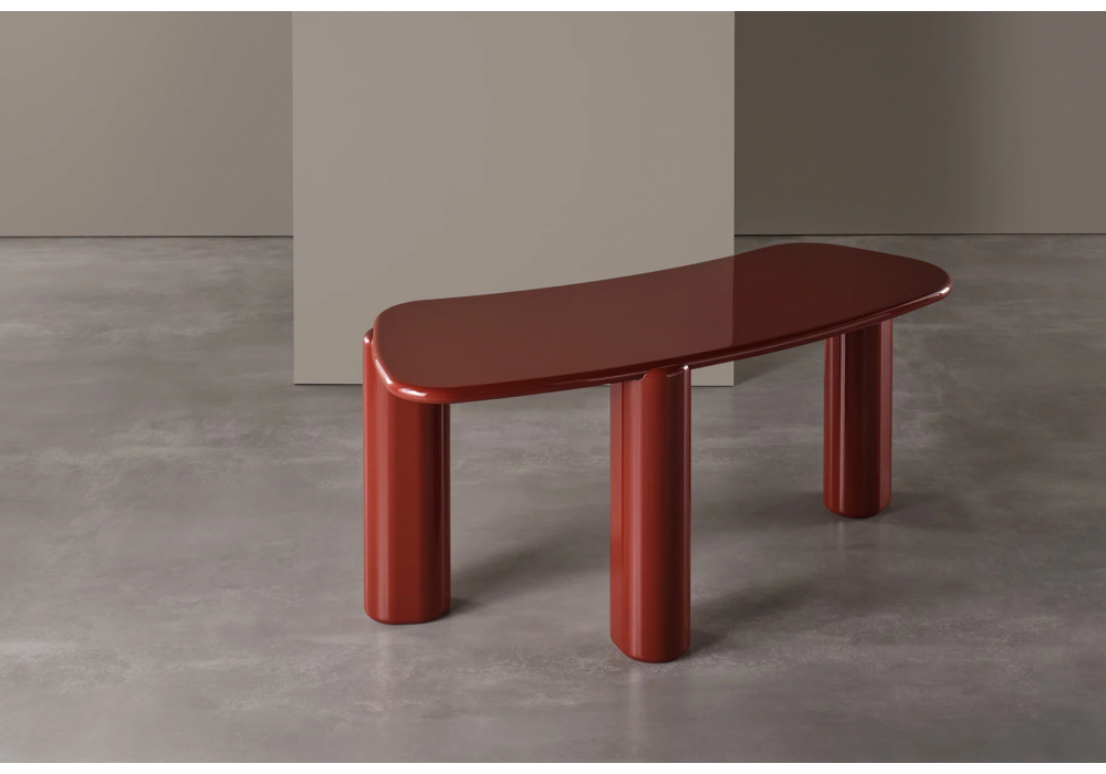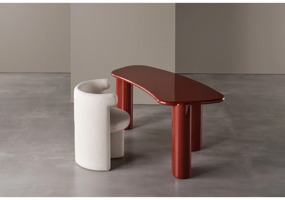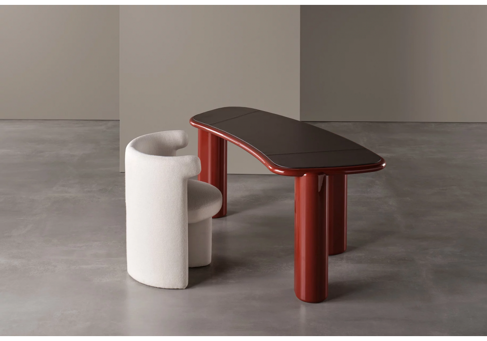 Henry designed by Andrea Parisio for Meridiani is a three-legged writing desk made in different glossy or matt finishes. A leather shelf can be added upon request.