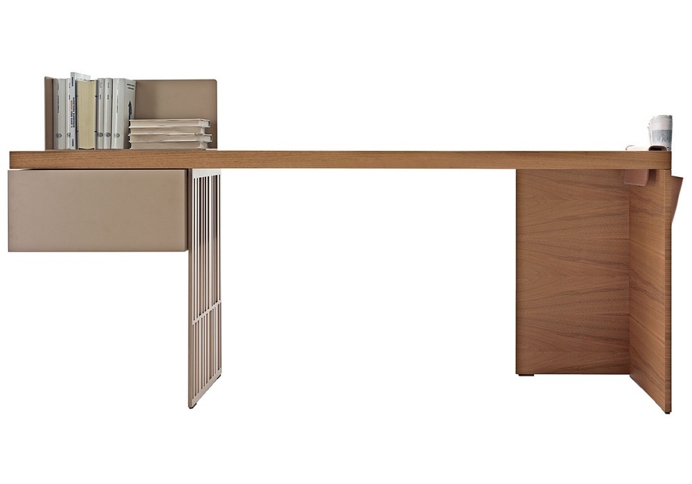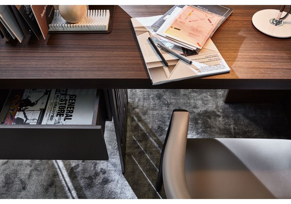 Scriba designed by Patricia Urquiola for Molteni&C is a desk with clean lines. Wood top, a practical side drawer, an ingenious bookend support in lacquered sheet metal and a side saddlebag in leather complete the desk. The bookend support rests on the top and can therefore be moved to the desired position and direction.