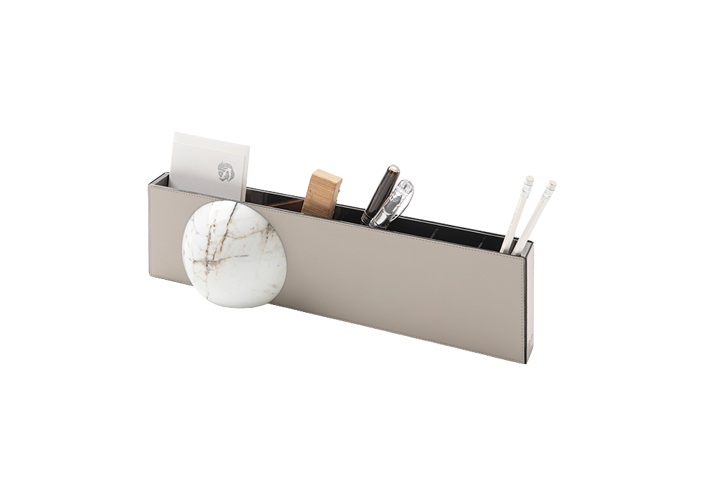 Organizador diseñado y producido por Giorgetti es un portaobjetos de metal revestido en piel con interior dividido en compartimentos de diferentes tamaños. Resina y piel se unen en cuatro posibles combinaciones cromáticas. Forma parte de la colección Pineider x Giorgetti.