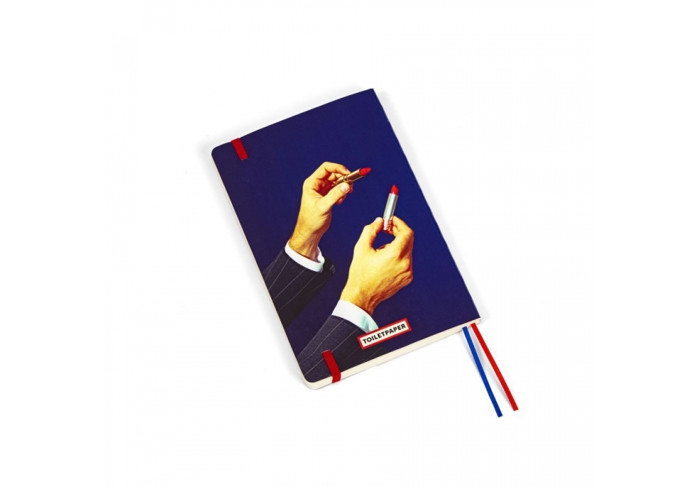 Lipsticks diseñada por Toiletpaper Magazine para Seletti es una libreta con tapa en material de papel recubierto de PU con fondo azul y marcas de colores. Las hojas interiores son de papel de color marfil.