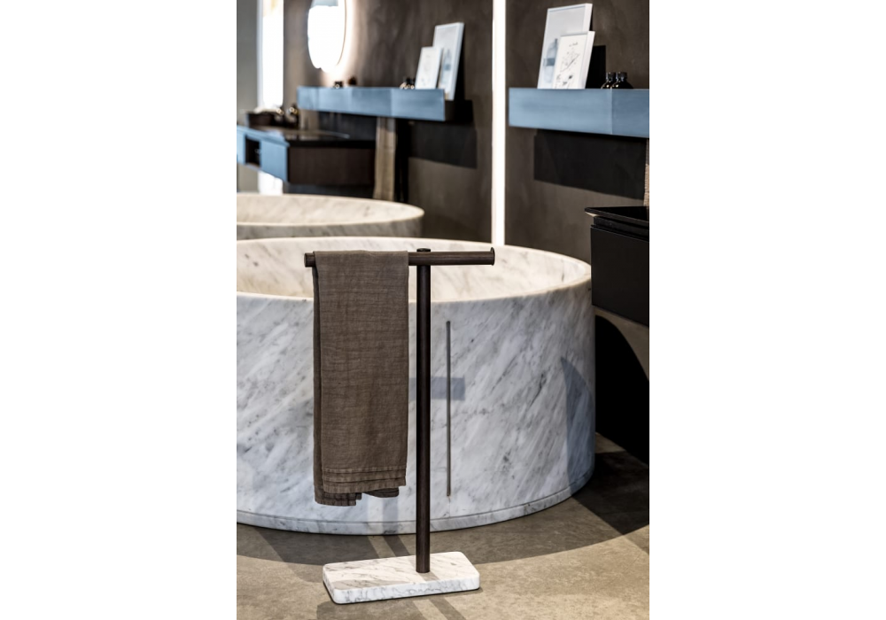 Dot Line diseñado por García Cumini para Agape es un toallero apoyado al suelo realizado con base de mármol y estructura tubular de aluminio con acabado anodizado negro cepillado o con revestimiento de roble en diferentes acabados.