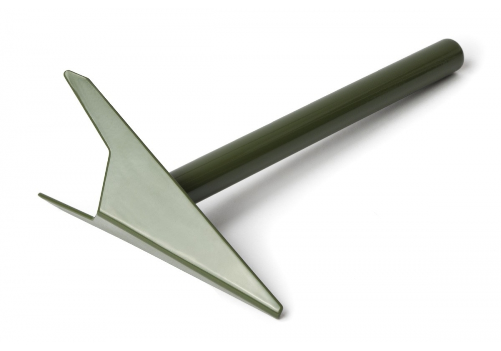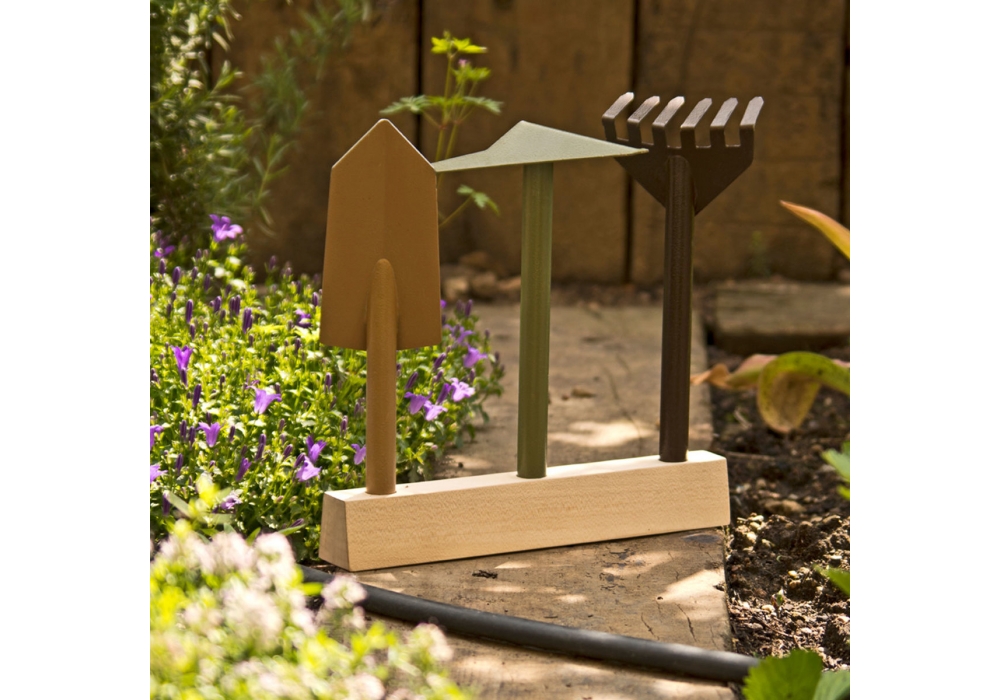 Orte diseñado por Giulio Iacchetti para InternoItaliano es un set de jardinería en metal pulido que consiste en una azada, un rastrillo, una pala y una base de madera donde se pueden guardar cuando se hace el trabajo.