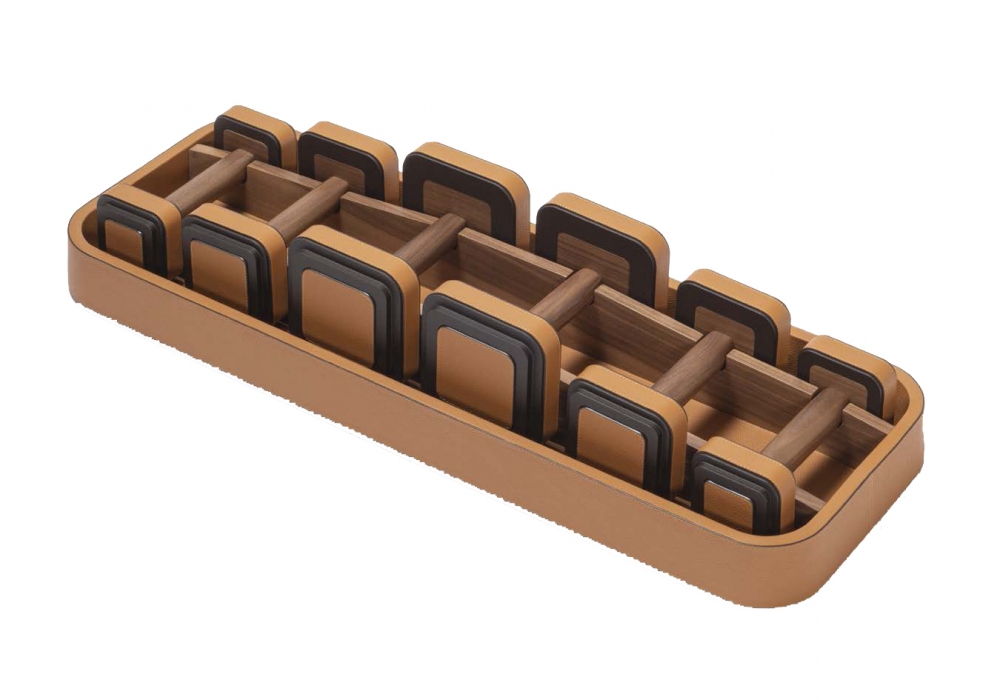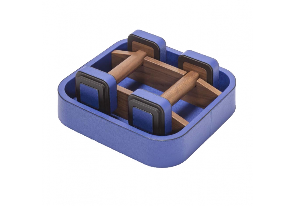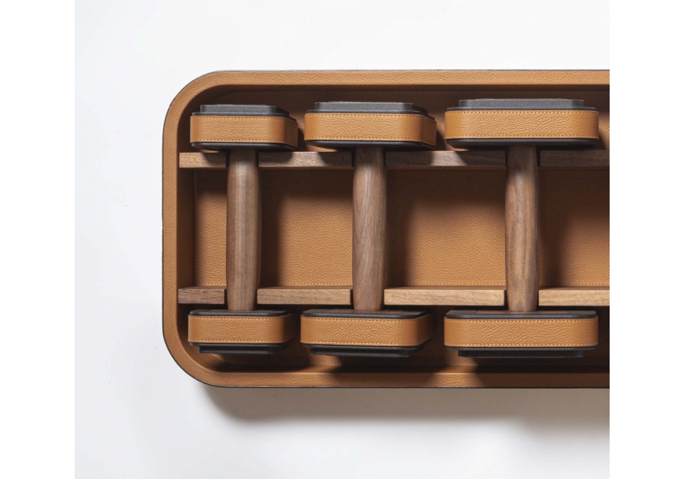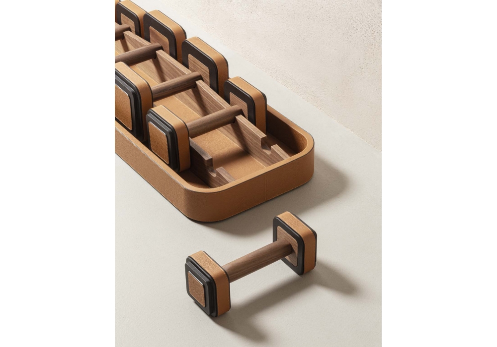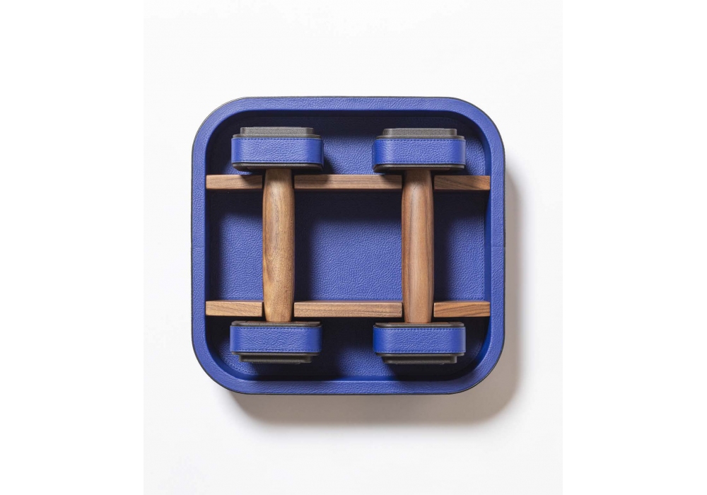 Juego de pesas diseñado por Giobagnara y Poltrona Frau. Pesas de acero parcialmente recubiertas de cuero ColorSphere® con mangos de madera de nogal. Están disponibles en juegos de dos mancuernas de 2 kg y en juegos de 6 mancuernas, incluidos dos de 2 kg, dos de 4 kg y dos de 6 kg. Ambos conjuntos se suministran con una bandeja para manillar realizada con una estructura de madera recubierta de Pelle Frau® ColorSphere®.