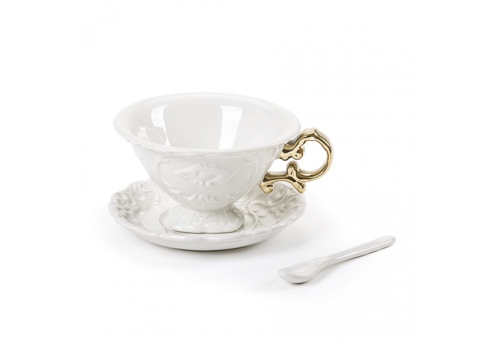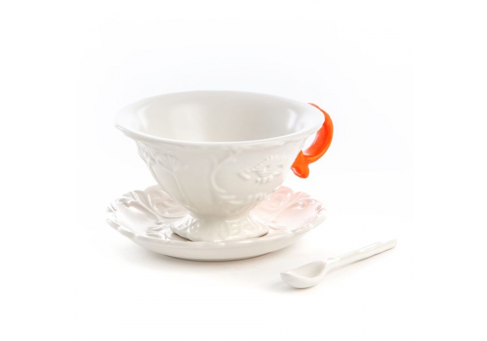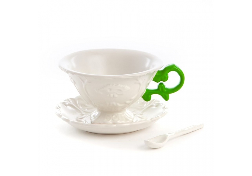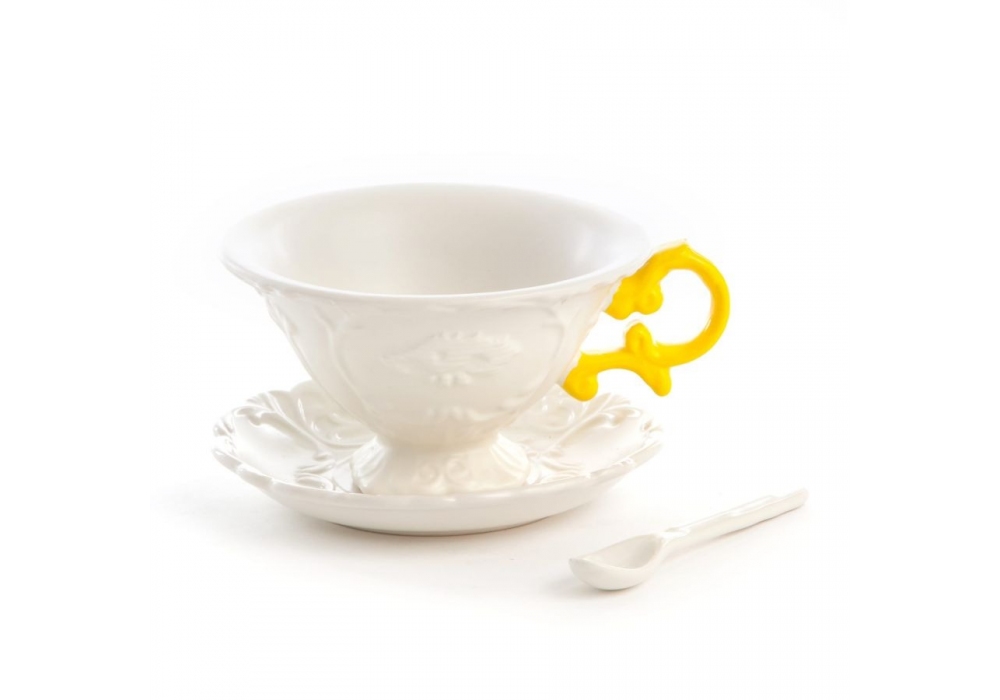 I Wares diseñada por Selab para Seletti es una taza de te en porcelana blanca con mango de color. El platillo portavasos tiene forma cuadrangular y también está fabricado en porcelana blanca equipado con una cucharilla del mismo material. I Wares está disponible en diferentes acabados.