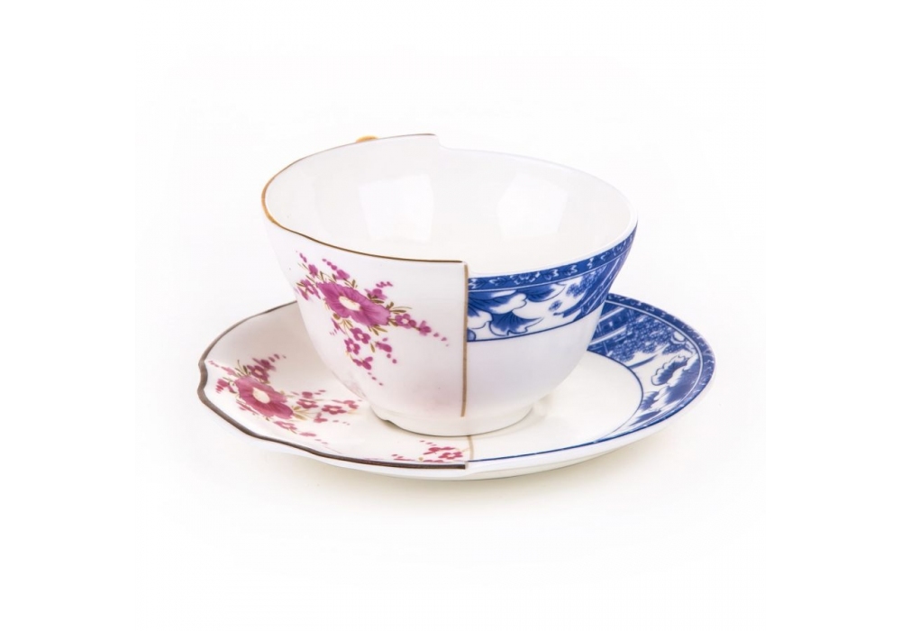 Hybrid Zenobia diseñada por CTRLZAK para Seletti es una taza de té y platillo en porcelana blanca con mango dorado. El conjunto está formado por la combinación de dos formas diferentes con estampados de colores en los laterales y en la parte superior del zapato.