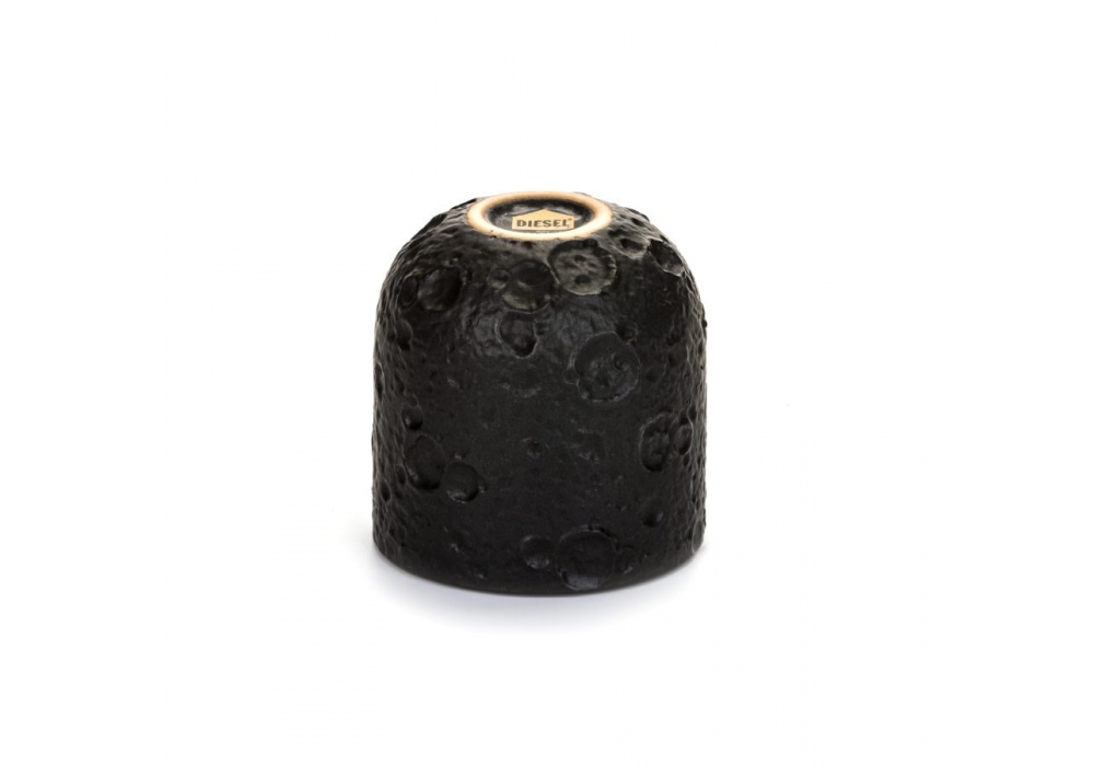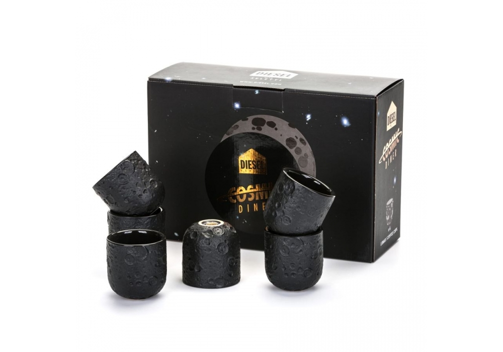 Cosmic Diner Lunar diseñada por Diesel Living with Seletti para Seletti es una taza de café de gres negro con una superficie porosa.