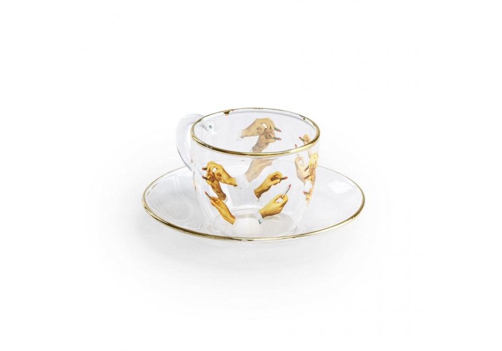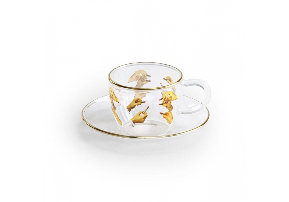 Lipsticks diseñada por Toiletpaper para Seletti es una taza de café con platillo en vidrio de borosilicato transparente. El borde tanto del platillo como de la taza es de color dorado, mientras que los estampados de los lados están coloreados con varios pigmentos.